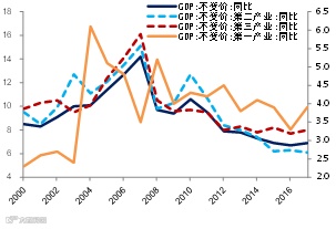 17年全年经济数据出炉,整体走势相对平稳,韧性较强,并未出现前期预测的明显的前高后低的走势,从具体分项来看,地产和基建投资相对弱势,制造业投资增速小幅提升,整体投资增速走平,全年消费保持弱平稳,不过乡村消费增速有大幅提升,工业增加值增速受上半年增速冲高的拉动中枢有小幅提升,对应的全年GDP增速亦受上半年增速小幅提高的影响较16年提升0.2个百分点,此外出口交货值增速中枢有明显提升。就对GDP增长的贡献率来看,第三产业贡献率持续上升至60%附近,对经济的拉动亦上升至4.86个百分点。服务业增速波动较小,因此影响经济增速走势的核心还是在于工业增速,但随着服务业占比的不断提升,未来对于服务业增速变动的相关研究也将更为重要。