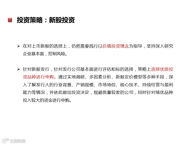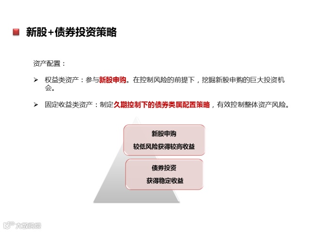 投资策略:本基金通过严谨的大类资产配置策略和个券精选策略,在做好风险管理的基础上,运用多样化的投资策略实现基金资产的稳定增值。本基金通过定性与定量研究相结合的方法,确定投资组合中股票、债券和现金类大类资产的配置比例。