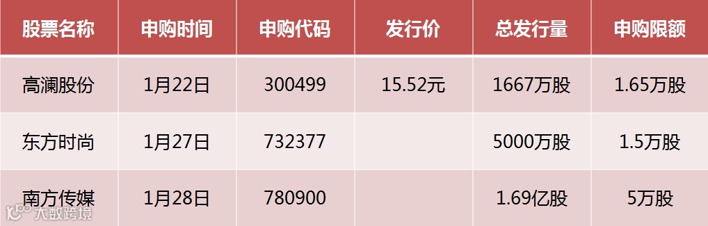 随即,南方传媒、东方时尚、高澜股份3只新股公布了最新招股说明书,申购日期已经出炉,最快可于1月22日(本周五)申购新股啦!