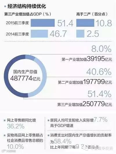 另外,转型升级的势头也非常好。在中央一系列“大众创业、万众创新”政策的推动下,中国的新产业、新业态、新产品、新经济、新动力成长是比较快的。1—9月份,全国网上零售额25914亿元,同比增长36.2%。新产品像新能源汽车都在翻倍增长。在工业结构中,1—9月份高技术产业增加值增长速度仍然达到10.4%,比规模以上工业增长速度高出4.2个百分点。