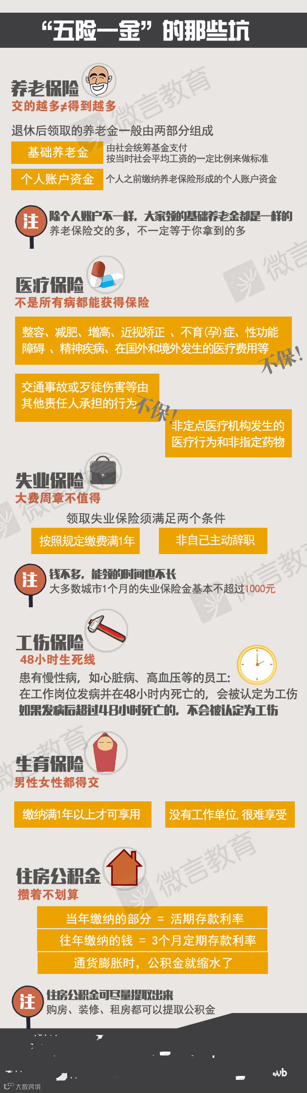 “五险”是国家规定企业必须为员工缴纳的,小伙伴们要注意单位的缴费基数,是否低于你的实际工资,避免某些单位在上面做文章。除此之外,“五险一金”的那些坑,你一定要知道!