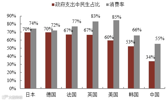 图1:我国的政府支出中民生相关占比和消费率均低于发达国家