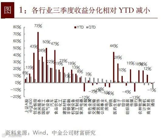 继续关注消费、医药和科技板块。国庆长假期间,全国接待旅客人次6.37亿人,旅游收入约4700亿元,同比分别恢复约8成、7成。数据显示在我国领先的疫情防控下,国内消费需求在持续恢复,建议继续关注消费板块,尤其是今年涨幅较低的纺织服装、家用电器、轻工制造等行业。