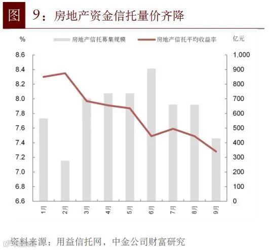 在此背景下,9月房地产类非标信托募集规模环比大幅下滑,优质项目稀缺,收益率同步下降,对投资者的吸引力大打折扣。未来非标信托的投资机会将越来越有限,建议投资者多关注债券基金及另类资产的投资机会,尽早做好固收投资净值化转型的应对。