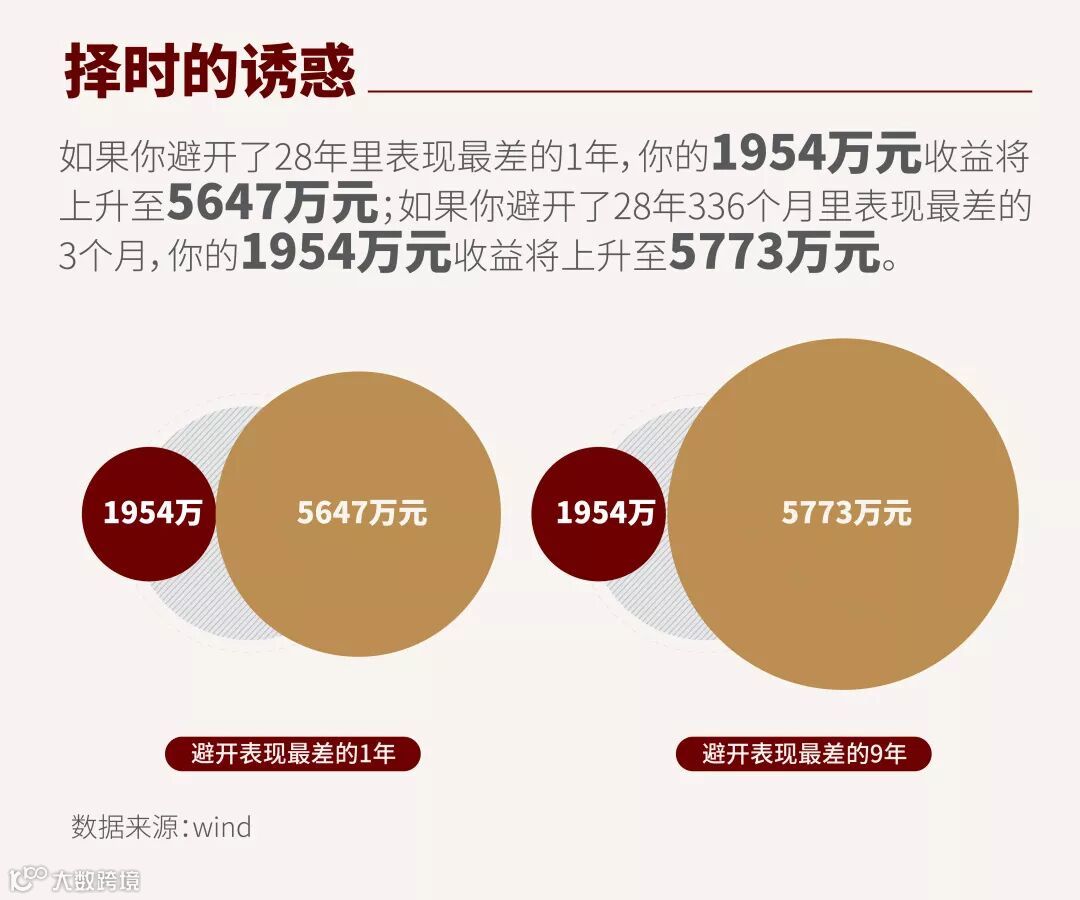 同样,如果你避开了28年里表现最差的1年,你的1954万元收益将上升至5647万元;如果你避开了28年336个月里表现最差的3个月,你的1954万元收益将上升至5773万元。