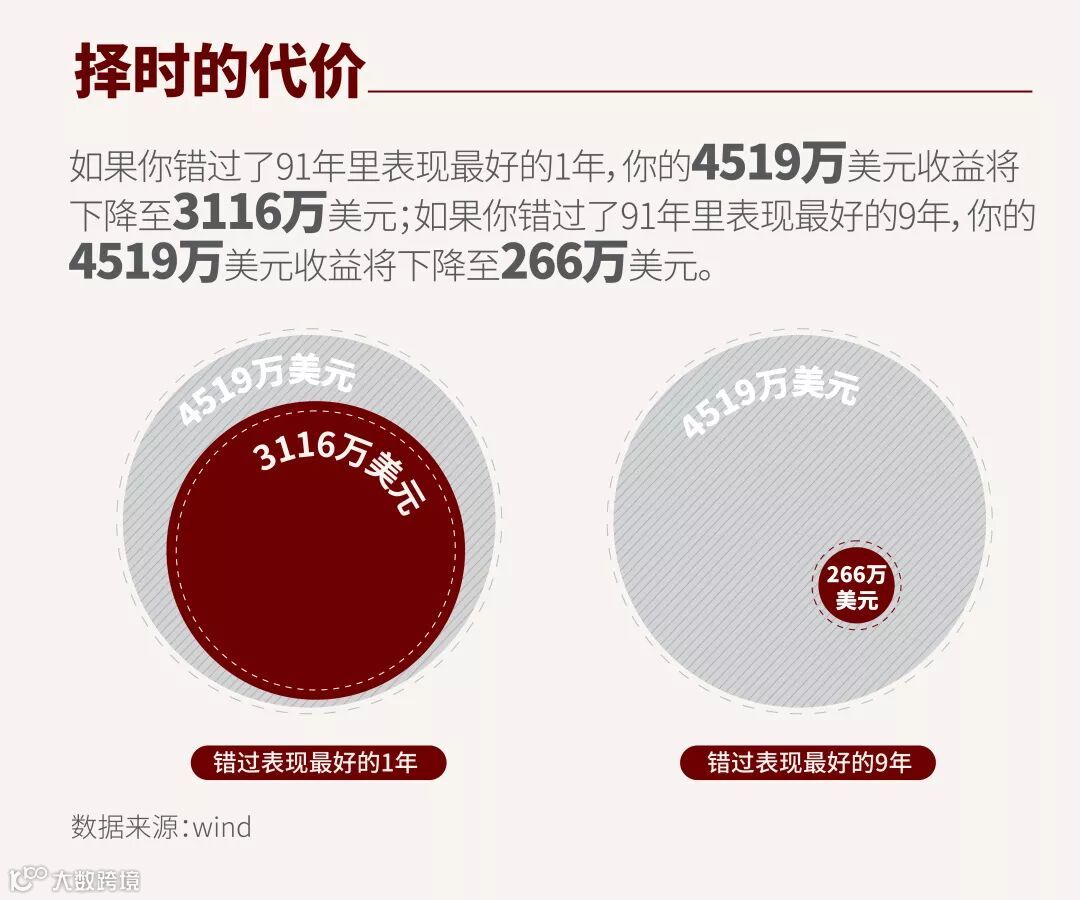 然而,如果你错过了91年里表现最好的1年,你的4519万美元收益将下降至3116万美元;如果你错过了91年里表现最好的9年,你的4519万美元收益将下降至266万美元。