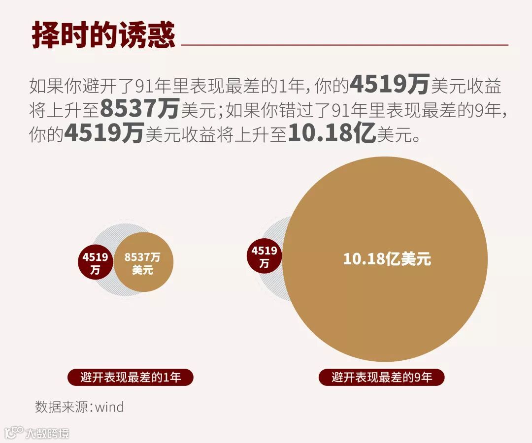 同样,如果你避开了91年里表现最差的1年,你的4519万美元收益将上升至8537万美元;如果你错过了91年里表现最差的9年,你的4519万美元收益将上升至10.18亿美元。