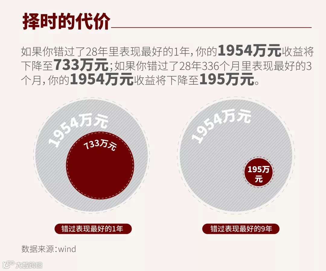 然而,如果你错过了28年里表现最好的1年,你的1954万元收益将下降至733万元;如果你错过了28年336个月里表现最好的3个月,你的1954万元收益将下降至195万元。