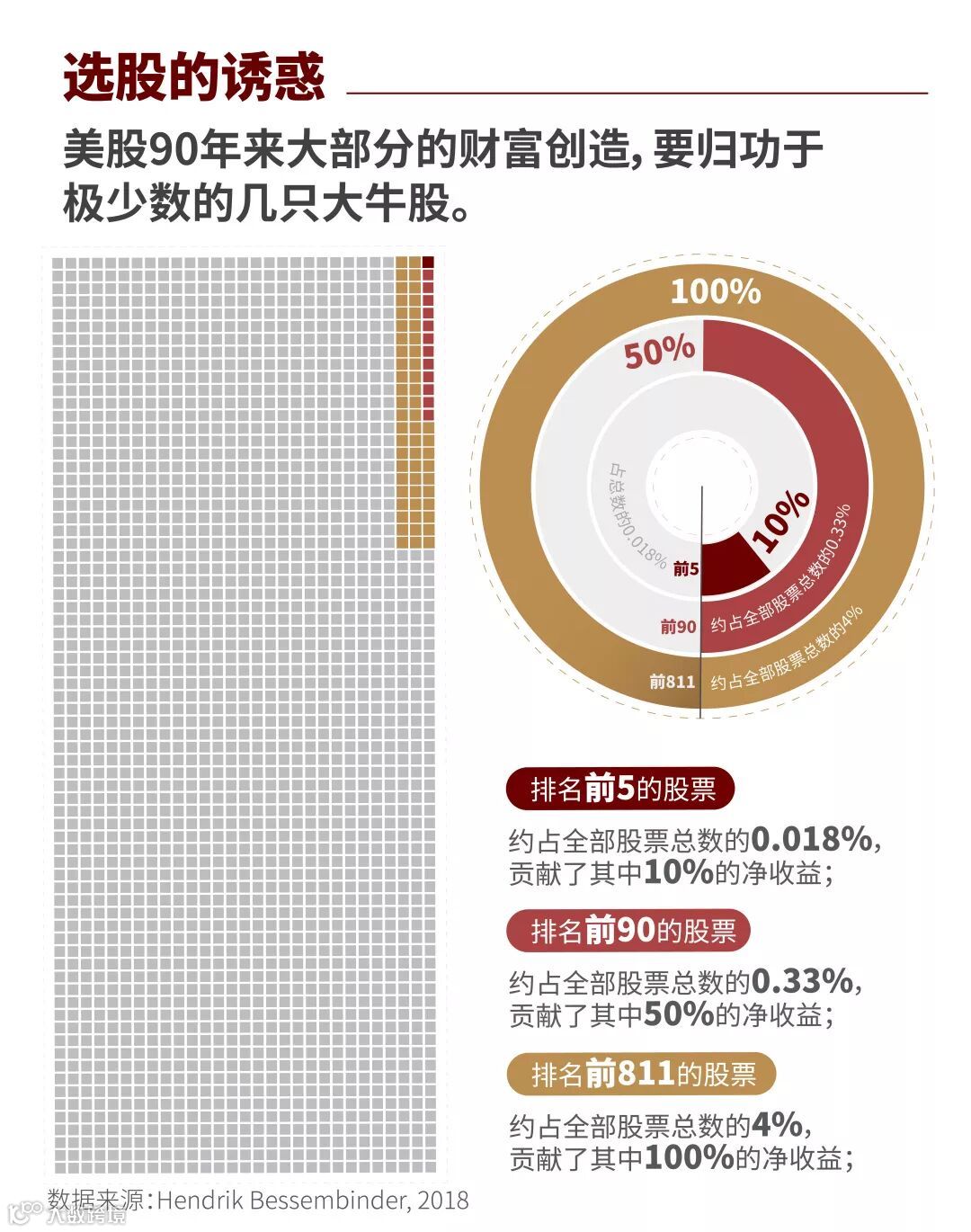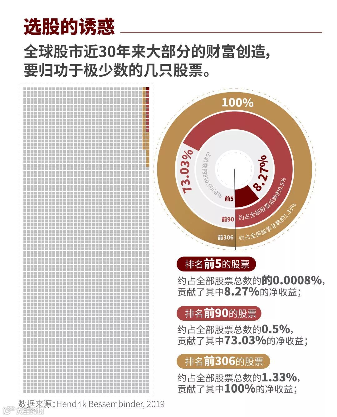 61100只股票28年间创造的44.74万亿美元净收益中,排名前5的股票(占股票总数的0.0008%)——苹果、微软、亚马逊、谷歌母公司、埃克森美孚——贡献了其中的8.27%;排名前306的股票(占股票总数的0.5%)贡献了其中的73.03%;排名前811的股票(占股票总数的1.33%)贡献了其中的100%。