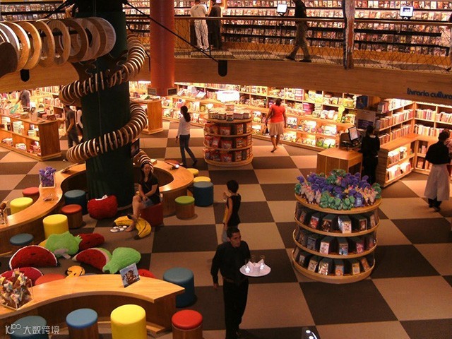 它不仅是巴西最大的书店,在某种意义上也是一个孩子的游乐园。在书店的大厅,The Livraria Cultura 陈列了一个巨型的恐龙雕塑,你还可以在整整四层的回廊上,浏览各类书籍。
