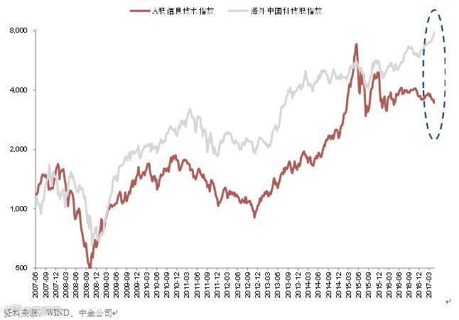 图2:境内外中国科技股价格近期分化显著