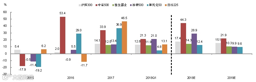 从已公布数据的企业样本来看,一季度国内A股(以中证800成分股为样本)净利润同比增长13.5%(15、16、17年增速分别为3.5%、5.2%、15.9%),其中非金融板块增长23.6%(15、16、17年增速分别为-8.3%、21.2%、29.1%)。从不同指数来看,沪深300、中证500、创业板指的成分股利润分别增长12.8%/21.3%/38.5%,而2017全年三大指数的利润增速分别为14%/34%/-7%,2016年对应增速为2%/53.4%/49.5%,2015年增速为5.4%/-17.9%/48.8%。