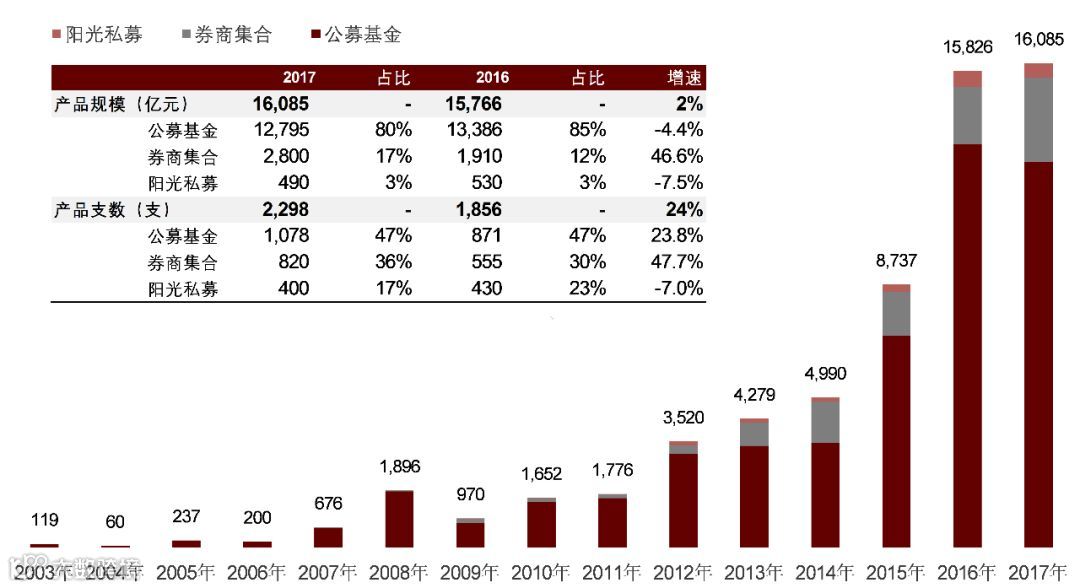 由于2016年四季度以来债市持续调整,2017年债券产品规模增速大幅放缓,截至2017年底,全部债券产品估算约16085亿元,较2016年底仅增长2%(2016年产品规模较2015年增长80%),其中公募债基和阳光私募规模均负增长。目前公募基金仍是债券产品的最主要部分,占比约80%。