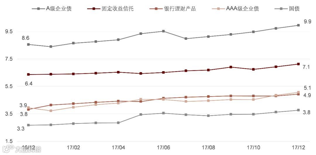 随着流动性的收紧,2017年各品种、各期限现金管理产品收益率普遍明显提高。以货币基金月度平均7日年化收益率为例,2017年收益率水平由年初的2.78%震荡上行至年末的4.37%;银行理财2017年末平均年化收益率较年初大幅提高了70BP左右,导致信托资金池相较于银行理财、公募基金等同期限产品的收益优势有所削弱。