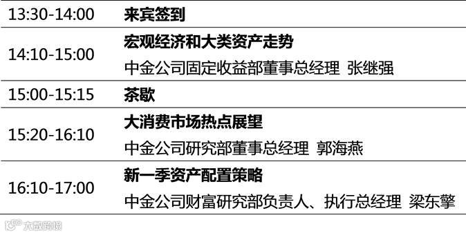 如何应对越趋复杂的市场形势,如何在股票、债券、房地产、另类投资、海外资产中通过大类资产配置,分散市场风险,实现长期可持续的资本增值?资产配置的重要性格外引人注目。本次活动我们邀请到中金公司固定收益部董事总经理张继强、研究部董事总经理郭海燕以及财富研究部负责人梁东擎就“宏观经济和大类资产走势”、“大消费市场热点展望”和“新一季资产配置策略”与客户进行交流。