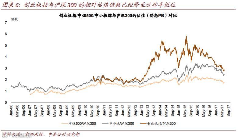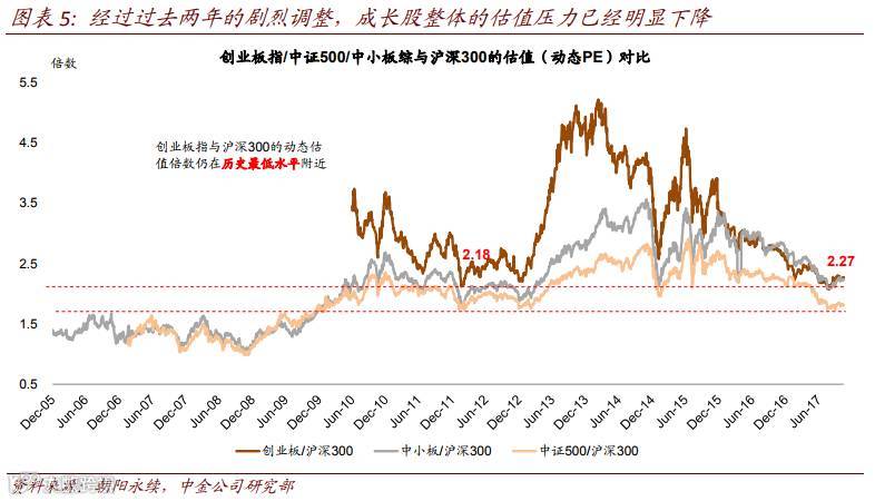 我们以朝阳永续提供的一致盈利预测估算,目前创业板前向12个月市盈率已经不到30倍,与沪深300指数的相对估值也回到了历史相对比较低的水平,部分个股看2018年估值已经不贵。另外,从公募基金的持仓看,机构对中小市值个股的持仓也已经大幅下降。虽然并非所有的个股都已经到了可以看的程度,但全部回避也并非可取的方法。我们认为在目前的环境下,成长股已经具备了选股基础。