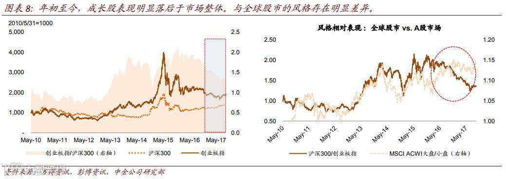 全球科技进步及应用深化(如人工智能、电动化与智能化汽车、互联网消费等)带动下,海外中资股和美股市场成长风格表现出色,MSCI China成长指数年初至今涨幅73%,明显好于同期的价值指数(24%),美股纳斯达克(年初至今涨幅23%)也跑赢标普500(年初至今涨幅14%)。相比之下,国内成长板块表现明显落后,创业板指年初至今下跌2%,创业板指成分股中年初至今取得正收益的公司不足一半。