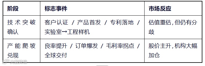 本文着重强调的是,真正穿越周期的高端制造企业,其超额收益集中于“技术突破确认期”与“产能爬坡兑现期”两个关键阶段。典型案例包括特斯拉、台积电、隆基绿能、宁德时代等,它们均在掌握核心技术、构建供应链优势并实现规模化量产之后,迎来估值与市值的非线性跃升。