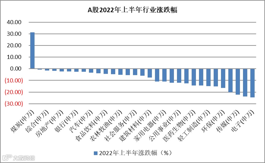 A股方面,上半年煤炭行业(申万一级)表现一枝独秀,涨幅为31.38%,其余板块均为下跌,跌幅最大的为电子行业,跌幅为24.46%,首尾行业表现差异巨大。