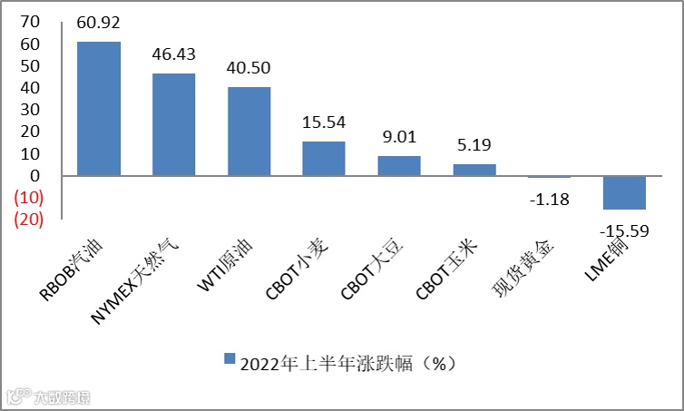 从2022年上半年主要大宗商品的表现可见,上游能源及食品价格涨幅较大,其中能源相关的品种汽油、天然气及原油涨幅分别为60.92%、46.43%及40.50%。由于能源及食品是社会经济的刚性需求和最基础的物资,其价格上涨势必传导到经济的每个环节。