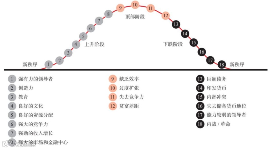 在这一过程中,他发现基于几乎相同的原因,国家的兴衰反复发生。通过考察许多相互关联的历史事件,达利欧总结了这种演化的典型模式和因果关系,并以此为基础推断未来。