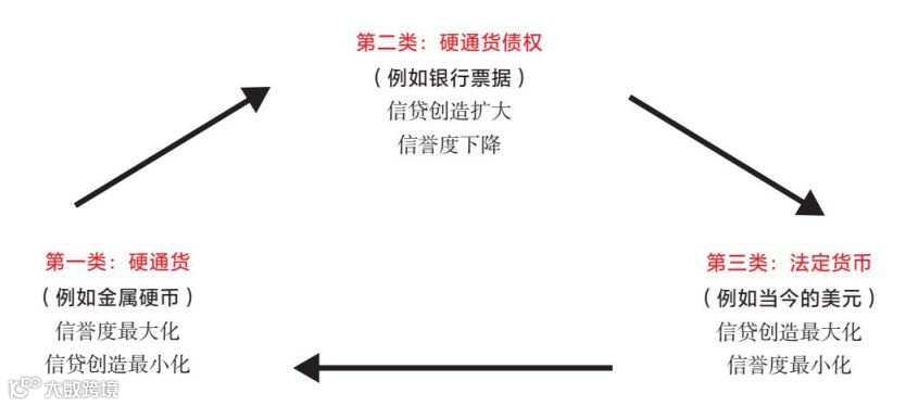 要搞懂债务和资本市场周期的演化,首先要明白货币体系的分类。债务/资本市场周期涉及3种货币体系:第一类是硬通货,也就是黄金、白银等金属硬币;第二类是硬通货债权,也就是银行票据和债券;第三类是法定货币,比如人民币、美元、英镑等。