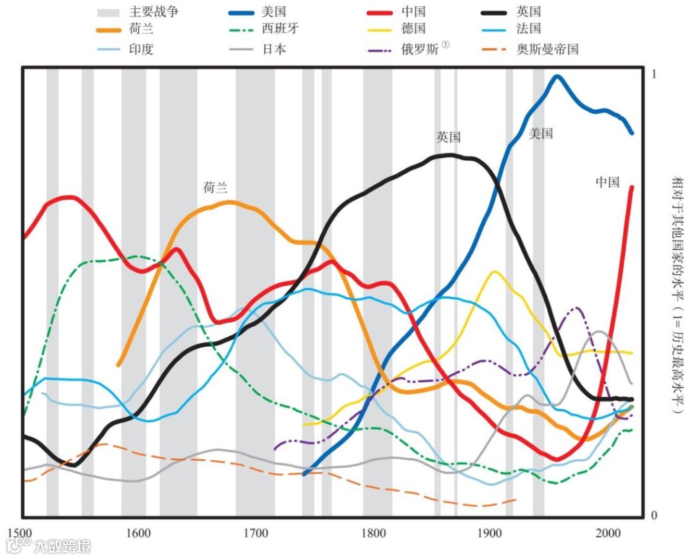 并由中间8项衡量经济体财富和权力的主要实力指标,得出过去500年里11个主要国家的相对财富和权力。较粗的四条线代表四个最重要的国家:荷兰、英国、美国和中国。其中三个国家持有了最近的三种储备货币——当前是美元,之前是英镑,再之前是荷兰盾。