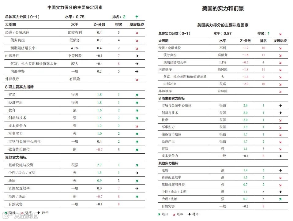 对照以上六个阶段,美国已经进入内部周期的第五阶段,财政状况糟糕且冲突激烈,但未来10年内进入第六阶段的可能性仅为30%。而中国目前处于内部秩序和混乱周期第三阶段,即和平与繁荣时期。