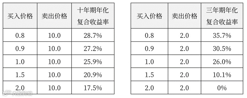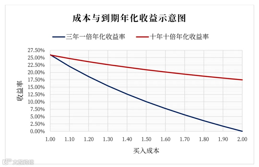 东方马拉松团队有一个原创性的数学原理证明:以一只“十年十倍”股和一只“三年一倍”股的买入成本与年化收益为例,如果都以成本1买入,两者的到期年复合收益率分别为25.9%与26.0%,收益率基本一致。但当二者均以高于成本价格买入时,投资结果却大为不同。