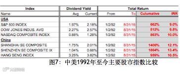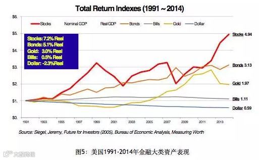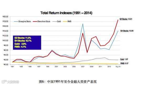 首先我们还是用数据来说话。我给大家看一下我们能够搜集到的过去的数据,对中国股市和其他市场的表现做一个比较。图5是美国从1991年底到去年底的数据,我们看到其表现几乎和过去两百年的模式是一样的,股票的投资在不断地增加价值,而现金在不断地丢失价值,这都是因为GDP的不断增长,和过去两百年基本上是一样的。