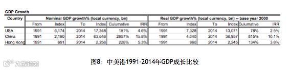我们看到的结果是,中国在过去二十年里的模式(Pattern)几乎和美国过去两百年是一模一样的。1991年至今的大类资产中,同样的一块钱现金变成4毛7,跟美金类似,黄金当然是一样的,上指、深指一直在增加,固定收益的结果基本也是增加。但不同的是,它的GDP发生了很大的变化。因为GDP的变化,它的股指、股票的表现更加符合GDP的表现。也就是说,比美国要高。在这样一个不发达的国家,我们居然看到了这样一个特殊的表现形式。我们看到的是在过去几十年里,第一,它的基本模式和美国是一样的;第二,它基本的动力原因也是GDP的增长。由于中国的GDP增长在这个阶段高于美国,直接导致的结果是它的通货膨胀率也高,现金丢失价值的速度也高,股票增长价值的速度也高。但是基本的形式一模一样。这就很有意思了。