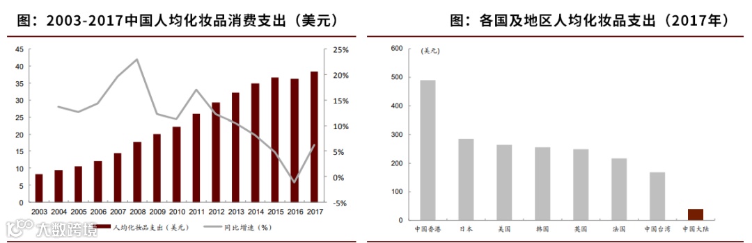 全球化妆品及个护市场规模在2019年达到近5000亿美元,同比增速4.6%。中国化妆品及个护市场规模上升速度更快,在2019年达到692亿美元,位列全球第二,同比增速13.8%,增速远高于其他成熟市场。据Euromonitor数据,2017年我国大陆地区人均化妆品消费支出为38.4美元,仅为英美的1/6,日韩的1/7。考虑到部分大陆消费者通过香港代购渠道购买美妆产品,即使对大陆与香港地区的人均支出加权平均后,我国人均化妆品消费支出也仅为40.8美元,未来成长空间广阔。