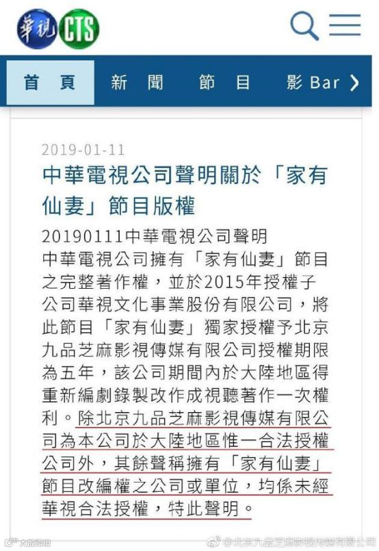 针对经典台剧《家有仙妻》即将翻拍内地版的消息,北京九品芝麻影视传媒有限公司官微发布声明,称该公司是台湾中华电视股份有限公司唯一合法授权重制电视剧《家有仙妻》单位,请相关影视公司和制作人立即停止侵权。