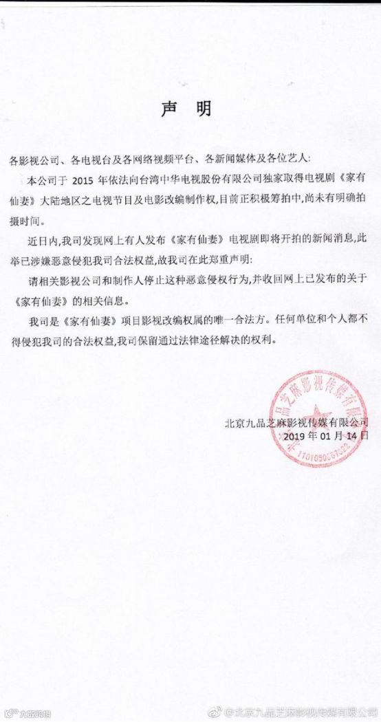 台湾轻喜剧《家有仙妻》围绕着一支神奇的超能力玉镯展开,由林以真、澎恰恰、孙兴等主演,于1991年4月23日至1991年6月17日在中华电视公司首播。近日,长信影视宣布将翻拍内地版,并请来原版的总导演伍宗德执导并任总编剧,郭靖宇担任监制,预计2月14日开机,引发热议。而今日下午,北京九品芝麻影视传媒有限公司官微发布声明,称该公司才是《家有仙妻》影视改编权属的唯一合法方,“本公司于2015年依法向台湾中华电视股份有限公司独家取得电视剧《家有仙妻》大陆地区之电视节目及电影改变制作权,目前正积极筹拍中,尚未有明确拍摄时间。”并艾特长信影视及郭靖宇,要求“停止恶意侵权,并收回网上已发布的关于《家有仙妻》的相关信息。”