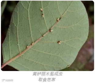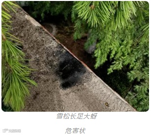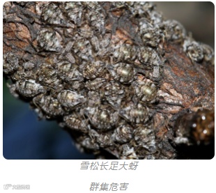 雪松长足大蚜—寄主雪松,以成虫、若虫在雪松枝条上刺吸危害。8月下旬开始危害,11月中旬开始有翅雄蚜、有翅雌蚜和无翅性蚜(雌)混合发生。常有大量蜜露滴落在被害树木下层的枝叶、地被植物或地面上。性蚜多在枝梢的针叶上产卵,2~8粒排列成行,偶尔将卵产在枝条上。