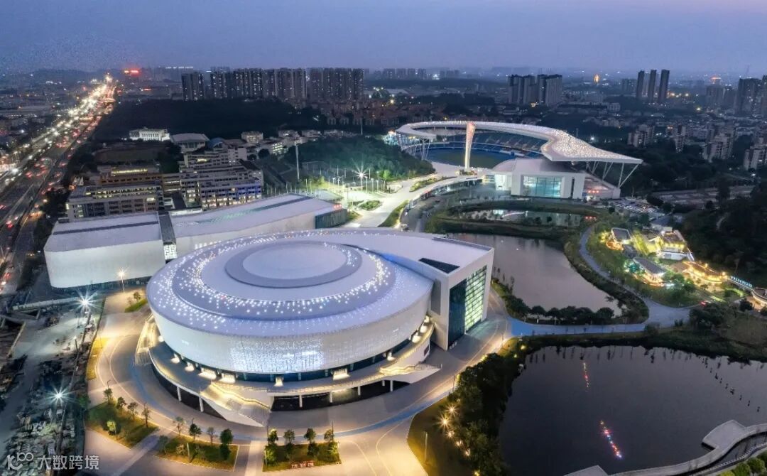 项目位于佛山市顺德区,由2万座综合体育场、1.3万座综合体育馆、2000座训练馆和2000座游泳馆以及配套商业与服务设施等构成,十五运期间将承办篮球项目女子成人组、足球项目女子成人组等赛事。设计方案以“龙腾大地、凤舞绿洲”为题,建筑体量沿河集中布局且错落展开,形成具有上升态势的有机整体,塑造出标志性建筑形象。同时,针对当地潮湿、高温、多雨的气候特点,体育中心运用立体交通系统构建立体开放性公共活动空间,景观河岸、地面景观广场、二层公共平台、架空层、上人景观屋面及多功能场地相互连通,为人们拓展了自由活动的层面与路径。