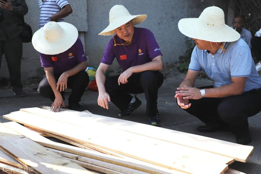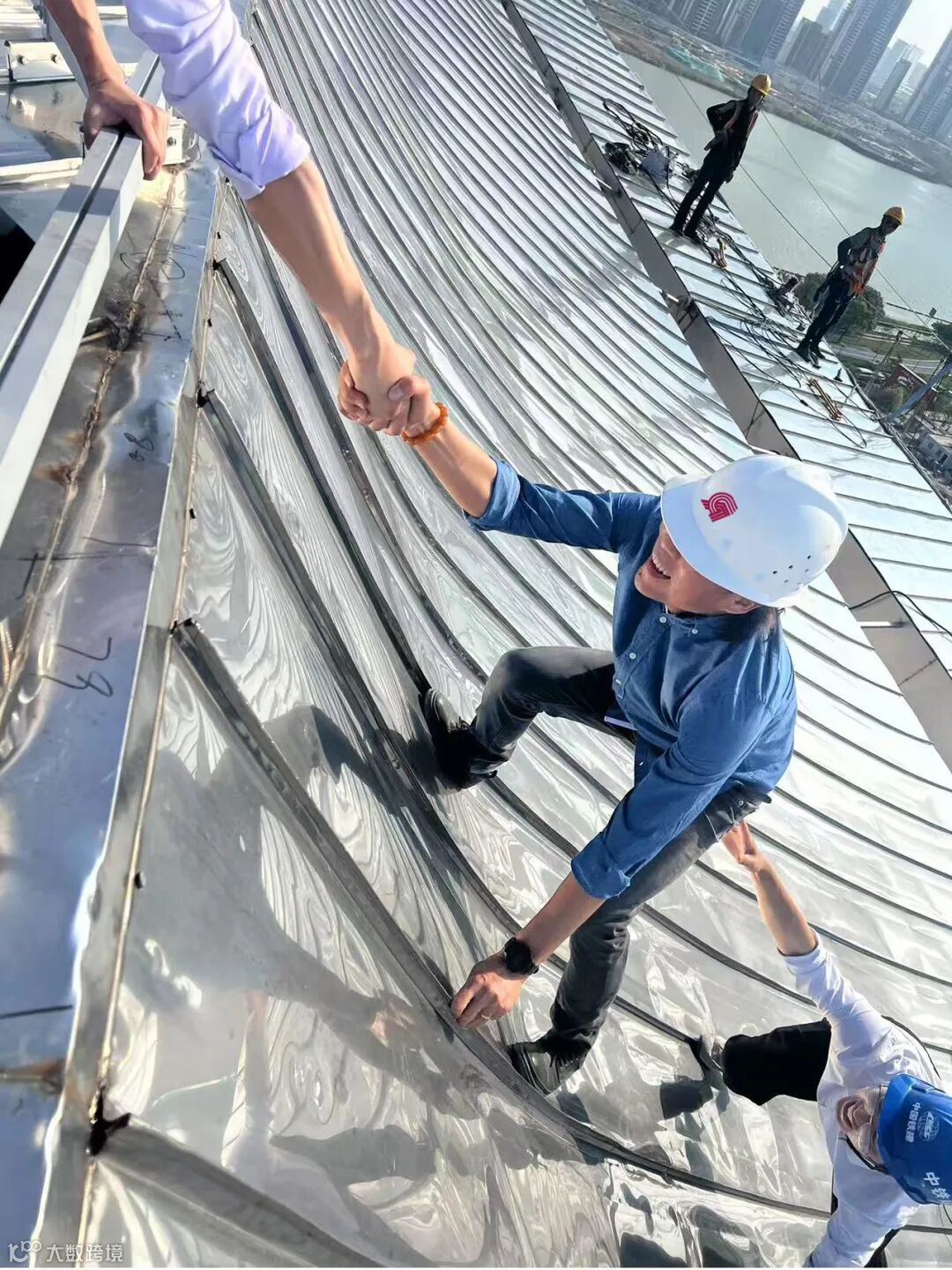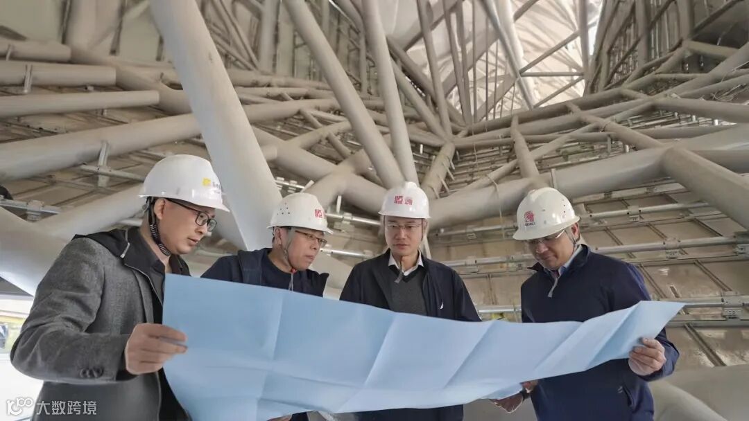 ▲洪卫(右一)在桂林漓江文化艺术中心工地研究金属屋面排水系统