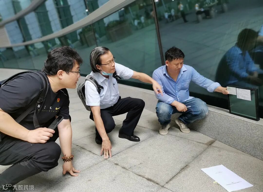 ▲陈雄(中)在揭阳潮汕机场项目工地比对幕墙玻璃效果