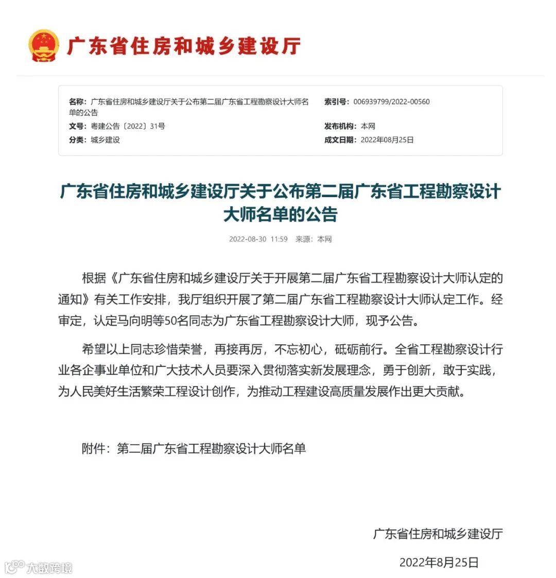 8月30日,广东省住房和城乡建设厅发布《关于公布第二届广东省工程勘察设计大师名单的公告》。广东省建筑设计研究院有限公司(以下简称省建院)党委副书记、电气专业执行总工程师陈建飚,总经理助理李德强,执行总建筑师江刚,执行总建筑师洪卫,执行总建筑师潘勇,结构专业执行总工程师苏恒强,市政道桥专业总工程师陈伟,勘察岩土专业总工程师石汉生等8位同志成功当选第二届广东省工程勘察设计大师。