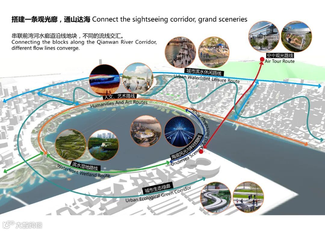 串联前湾河水廊道沿线地块,不同的流线交汇。