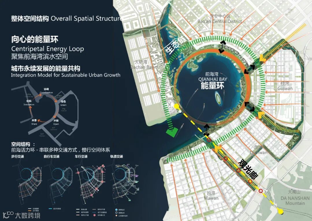 前海能量环是注重协调、创新、共享、开放、绿色的活力环,串联多种交通方式,慢行空间体系。通过步行交通、自行车交通、车行交通和轨道交通打造前海前卫环保高效的出行活力体系。