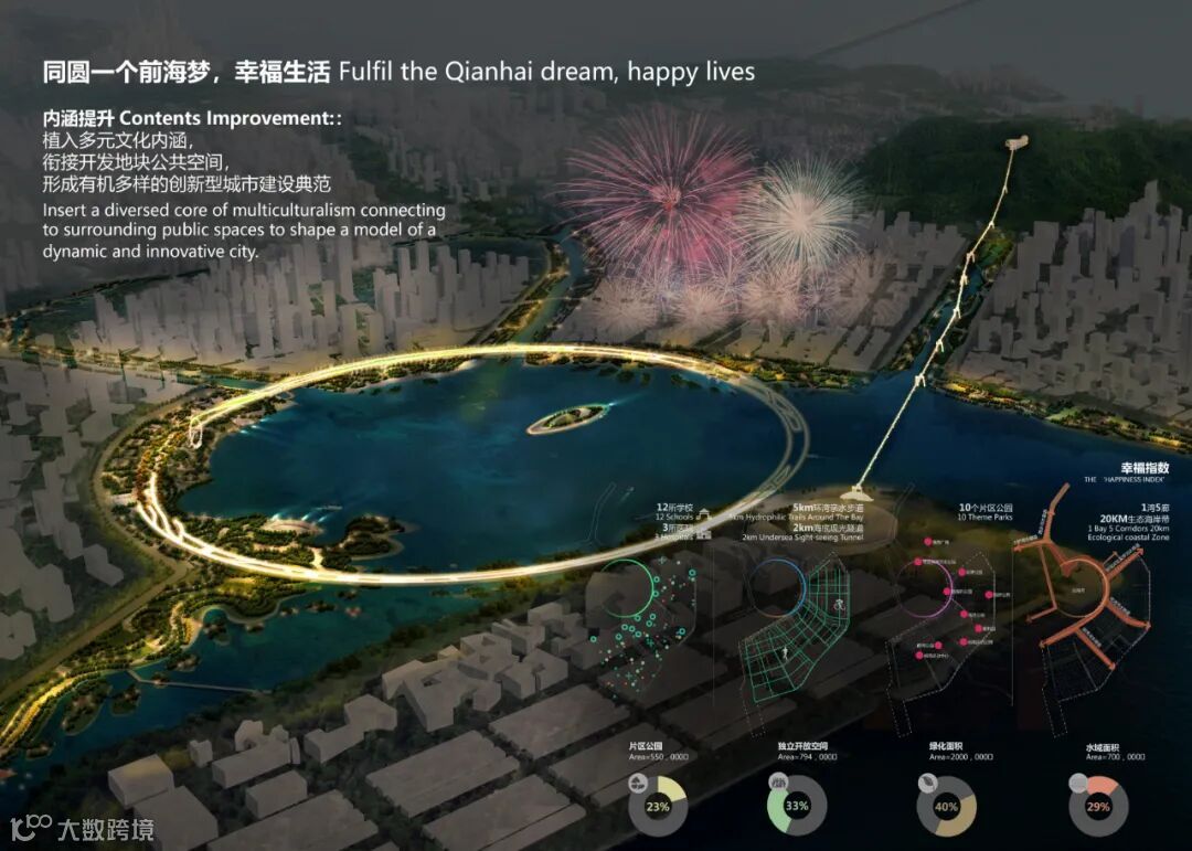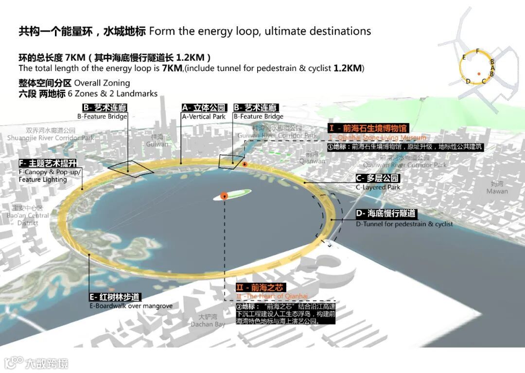 前海能量环的总长度为7KM,其中海底慢行隧道长1.2KM,环的中心为前海之芯,结合沿江高速下沉工程建设人工生态浮岛,构建前海湾特色地标与海上演艺公园,打造前海水城地标。