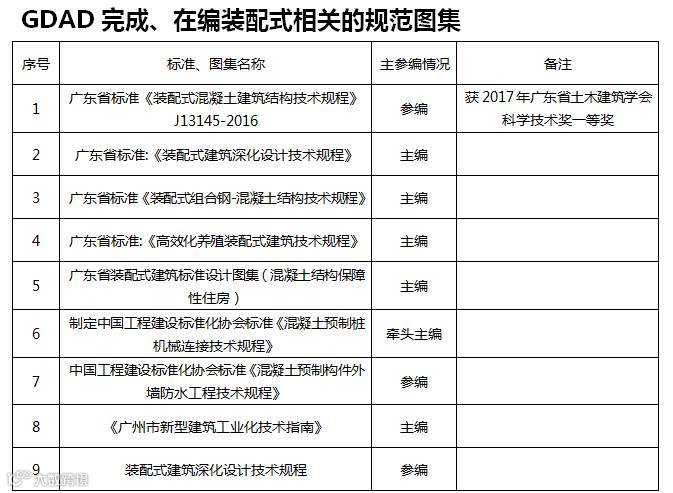 GDAD以广东省现代建筑设计工程技术研究中心(省级科研平台)为主的装配式建筑研究部门,携手多部门,积极开展装配式建筑研究与实践工作,取得了一系列成果,有效推动了省内装配式建筑产业的发展。目前,GDAD累计完成各类装配式建筑300多万平方米,并获得了多个国家级、省部级奖项;现承担相关课题研究6项,拥有装配式专利15项;主编或参编的规范图集8本;与国内建设行业多个大型企业达成战略合作,通力协作,努力推进装配式建筑发展。
