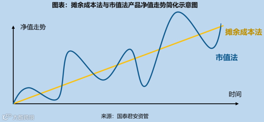与之相对的估值方法叫“市值法”,是根据市场交易价格对债券进行估值,债券价格涨了,投向债券的理财产品净值也跟着涨,反之亦然。下面这张图清晰地展示了摊余成本法和市值法的区别: