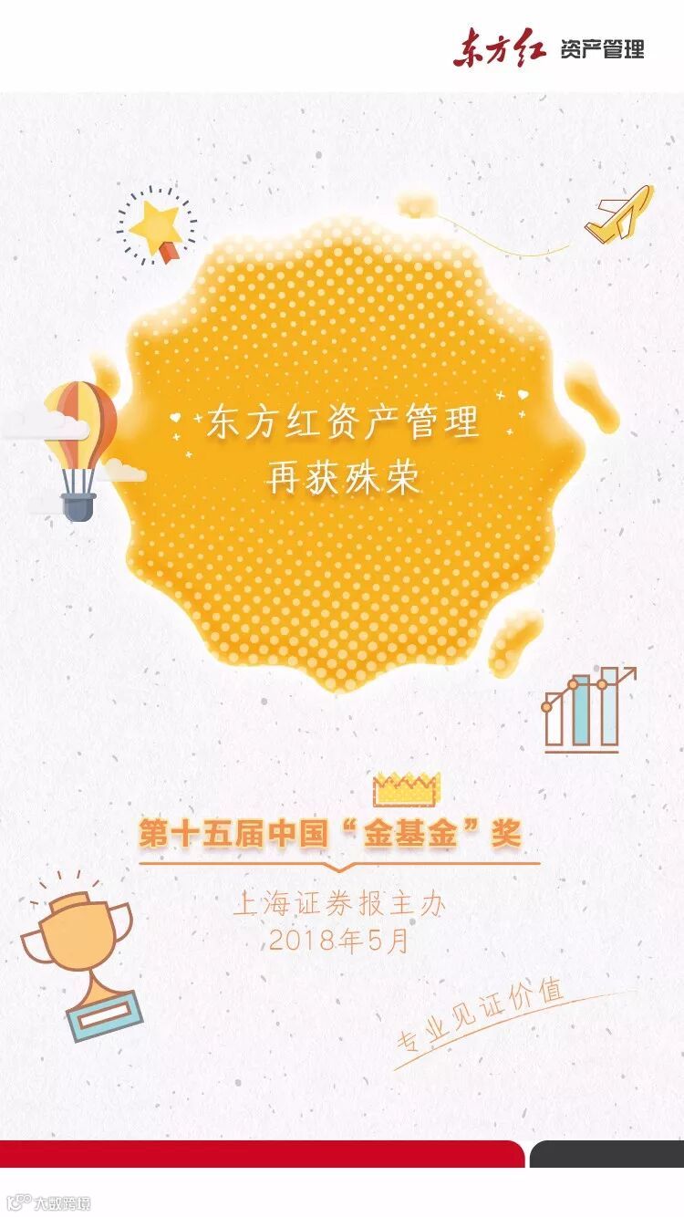 2018年5月10日,由上海证券报主办的第15届中国“金基金奖”隆重揭晓。凭借出色的综合资产管理能力和优秀的业绩表现,东方红产业升级混合基金、东方红沪港深混合基金分获金基金一年期、三年期灵活配置基金奖,公司副总经理饶刚先生荣膺公募基金20年“金基金•最佳投资回报基金经理奖”。