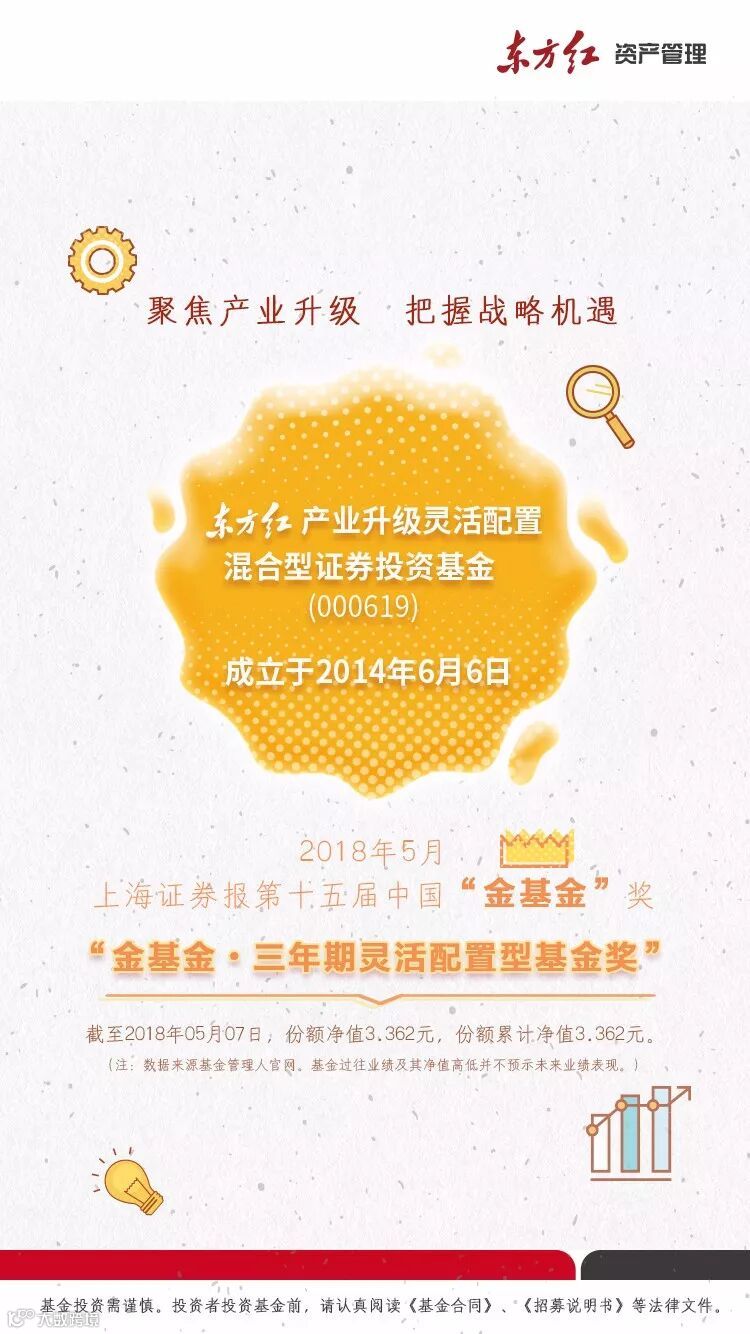 5月10日,由上海证券报主办的第十五届中国“金基金”奖揭晓榜单。凭借出色的综合资产管理能力和优秀的业绩表现,东方红系列2只基金荣获金基金奖,东方红资产管理副总经理饶刚先生荣膺基金20年“金基金•最佳投资回报基金经理奖”。其中,东方红产业升级混合基金荣获“金基金•三年期灵活配置型基金奖”,东方红沪港深混合基金荣获“金基金•一年期灵活配置型基金奖”荣誉称号。