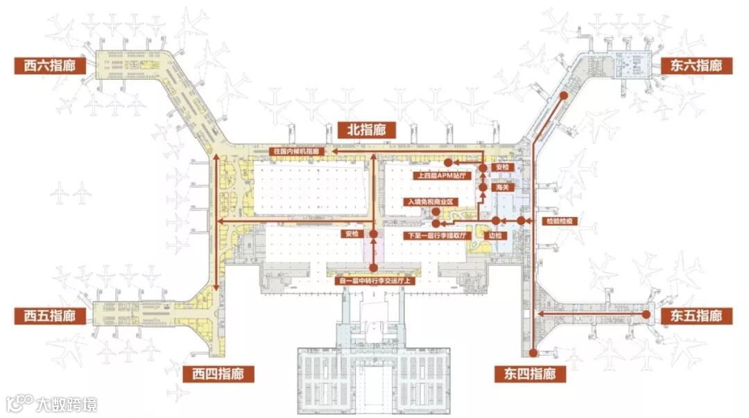 前列式北指廊离出发安检、行李机房及行李提取厅最近,是最便捷、高效的指廊,为使国际国内旅客都能享受北指廊的便利性,同时提高登机桥利用率,将北指廊机位设置为可转换机位,将国际、国内出发和到达楼层立体叠加,共用登机桥固定端及机位,利用国际、国内航班错峰特点共用机位及登机桥,有效提高了登机桥利用率及航班靠桥率。