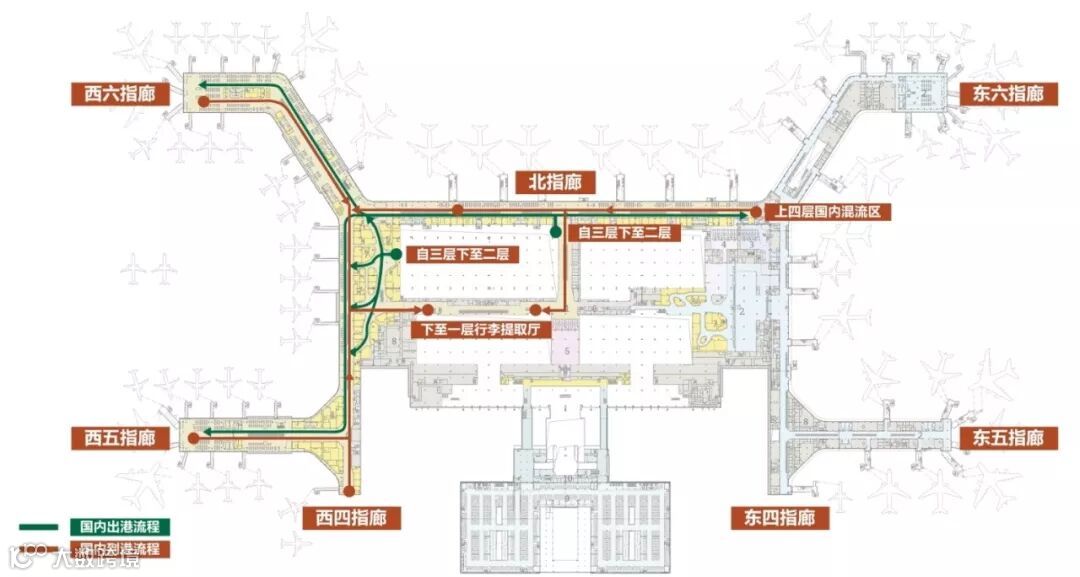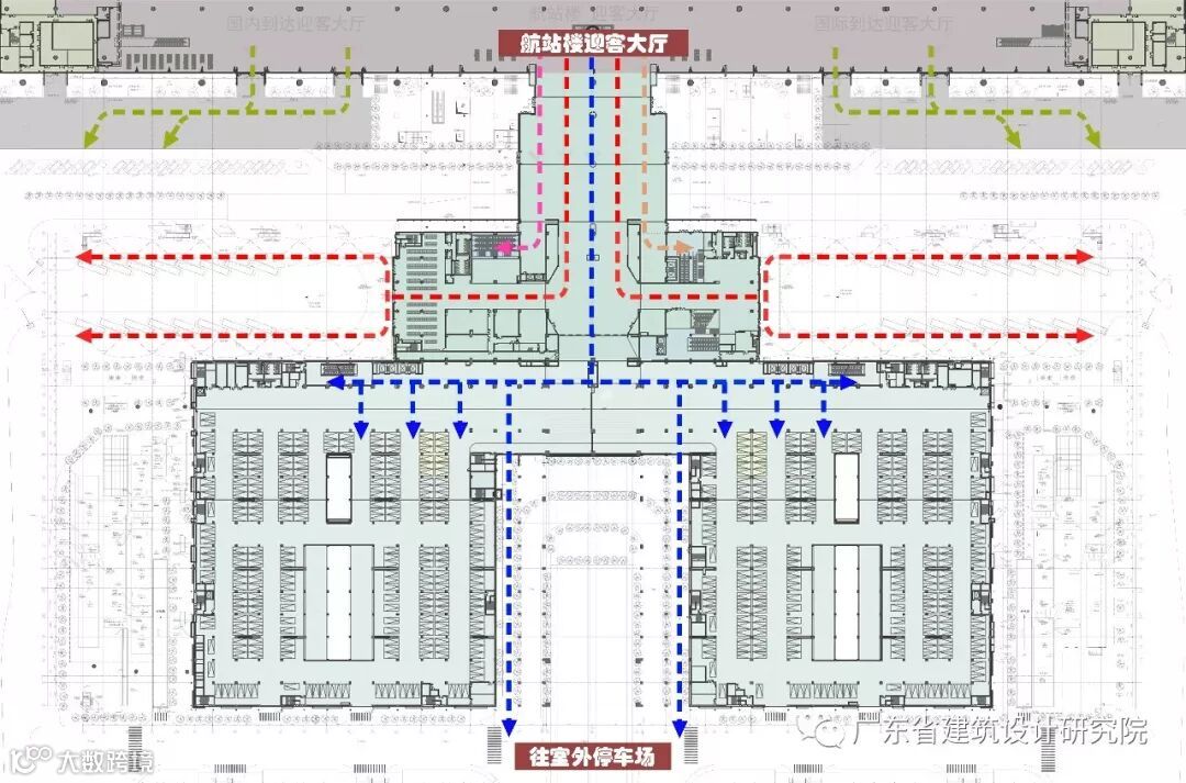 二号航站楼采用国内混流,国际分流的策略来构建流程框架,设置了覆盖基地航空公司南方航空所有市场产品流线,对重点中转流线采取平层策略,中转旅客到达、中转和候机全程无需换层,流程高效便捷,楼内采用单一方向的旅客流程策略,流程清晰、导向明确。