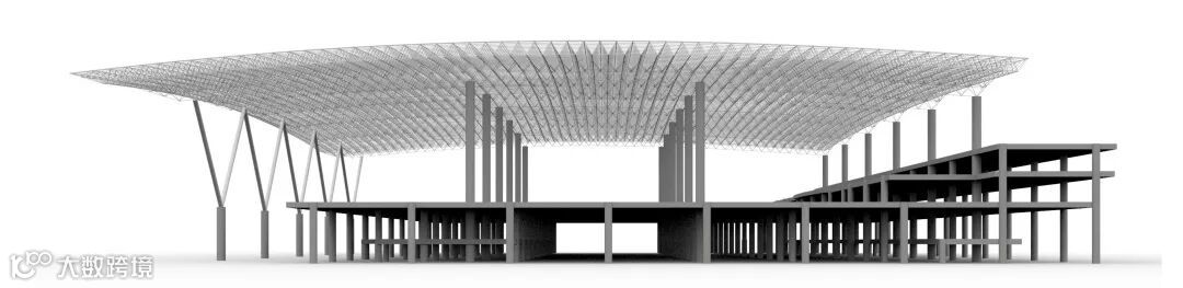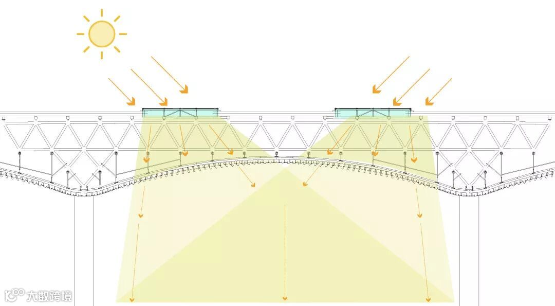 屋面结构与建筑装修及照明一体化设计,结构体系受力合理、造价经济。出发大厅纵向设置的加肋网架与室内波浪形吊顶造型及照明高度匹配,一气呵成,表达出建筑“轻盈、漂浮、流动”的感觉。