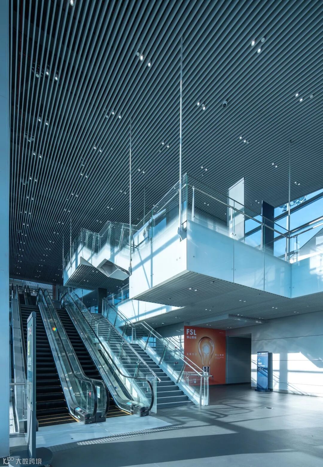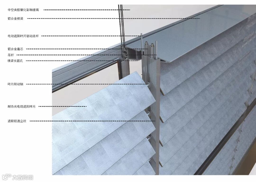 遮阳系统选用机翼型电动可调遮阳百叶,可根据不同时刻太阳角度调节遮阳效果,百叶选用微孔板,达到遮阳且透影的效果,在实现遮阳效果的前提下,最大限度的满足了空间通透性,创造一个舒适的室内空间。